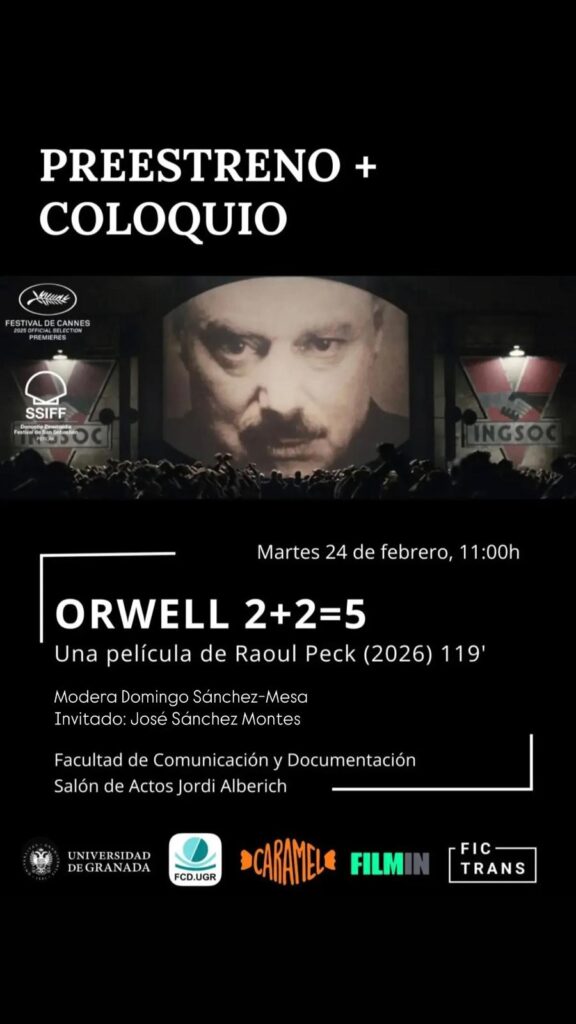 El martes 24 de febrero tendrá lugar en la Facultad de Comunicación y Documentación de Granada el preestreno de Orwell 2+2=5 (Raoul Peck, 2026). La proyección tendrá lugar a las 11:00 hrs. en el Salón de Actos Jordi Alberich. La presentación estará a cargo de Domingo Sánchez-Mesa, quien también moderará el posterior coloquio junto al director granadino José Sánchez-Montes.