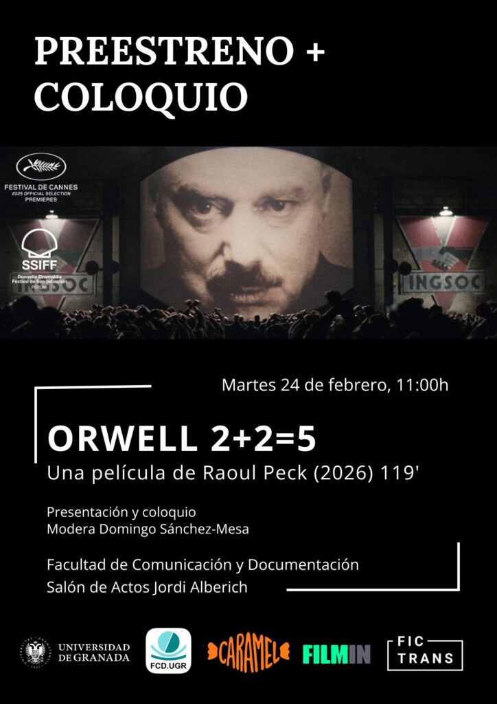 El martes 24 de febrero tendrá lugar en la Facultad de Comunicación y Documentación de Granada el preestreno de Orwell 2+2=5 (Raoul Peck, 2026). La proyección tendrá lugar a las 11:00 hrs. en el Salón de Actos Jordi Alberich. La presentación y el posterior coloquio estarán a cargo de Domingo Sánchez-Mesa.